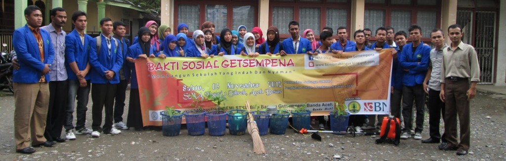 BANDA ACEH – BEM STKIP Bina Bangsa Getsempena mengadakan Bakti Sosial (Baksos) di tiga SMA se Aceh Besasr pada Sabtu (03/11/2012). Ketua BEM STKIP Bina Bangsa Getsempena, Zakiyul Vuady mengatakan pihaknya BEM mengadakan kegiatan ini di tiga Seolah di Aceh Besar secara berturut-turut yaitu, SMA Negeri 1 Sibreh Aceh Besar, SMA Negeri 1 Baitussalam Aceh Besar, SMA Negeri 1 Lhoong Aceh Besar.